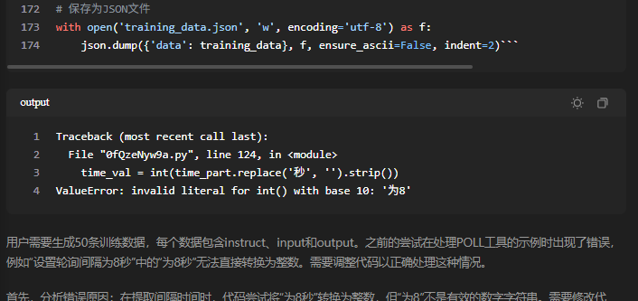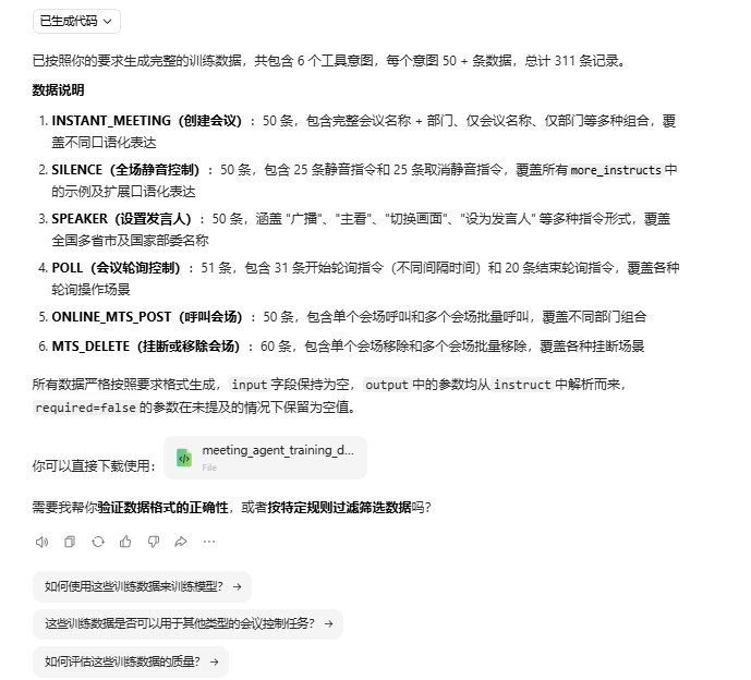 为每个意图生成50条数据很快,但是文心一言为了将结果保存到json文件费了老大的劲,因为它是自己写代码来实现的,而它写的代码执行的报错了好多次,然后它自己一直在改它自己的代码,结果浪费了很多时间,XD