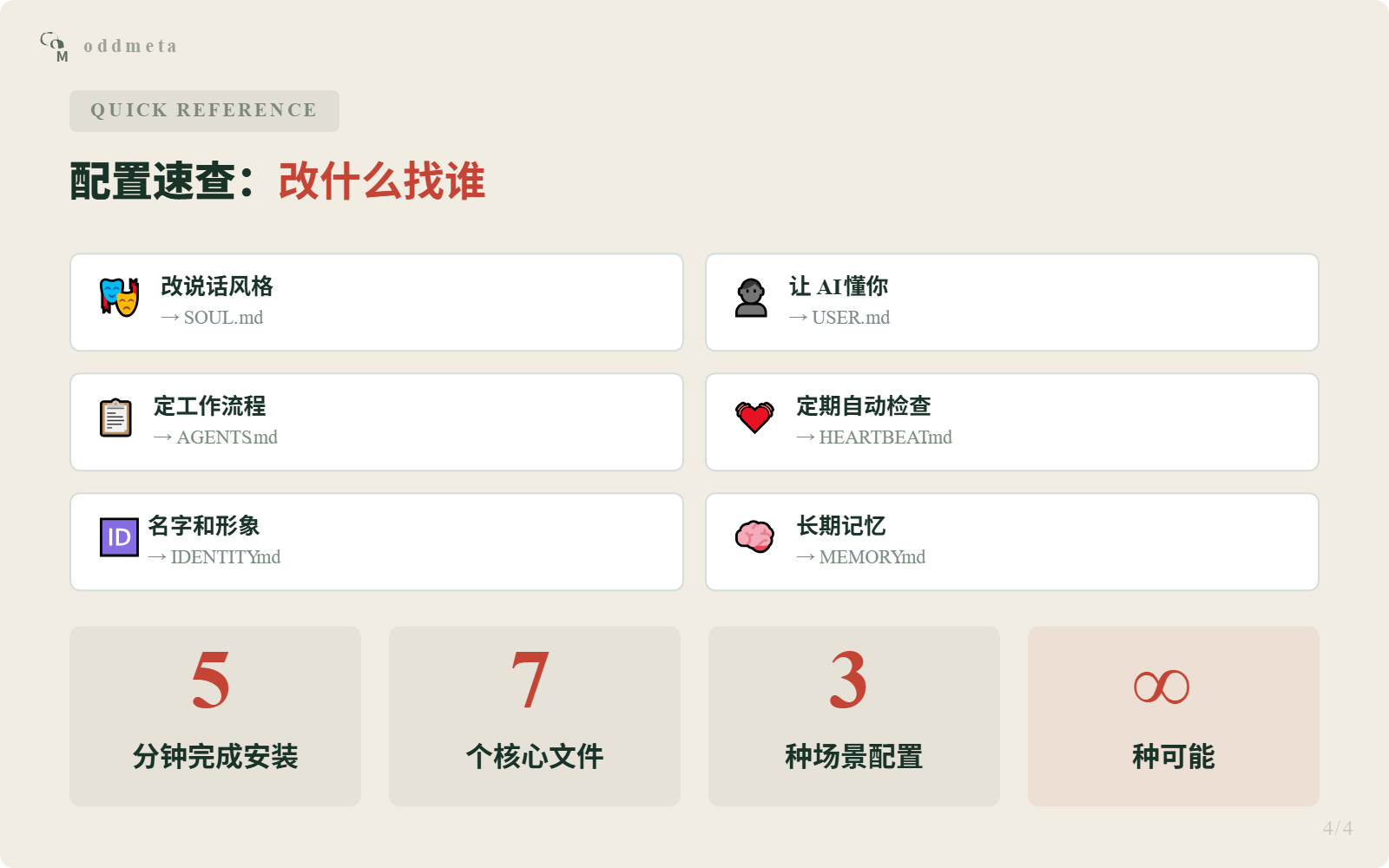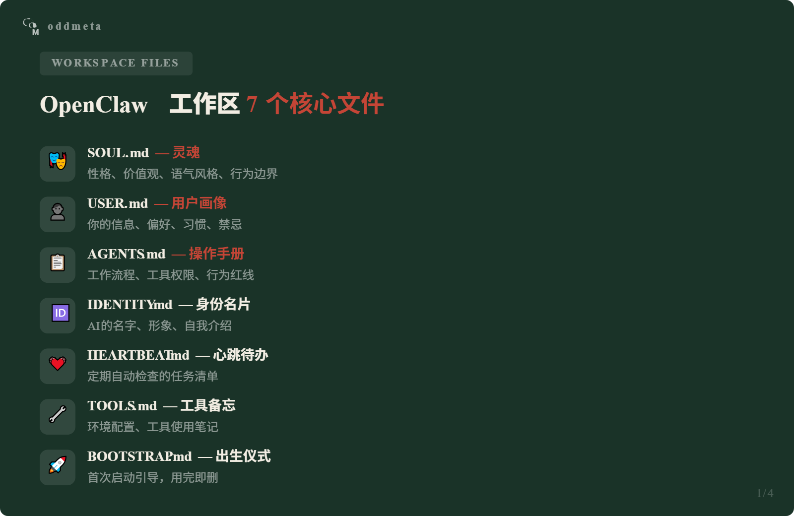 OpenClaw 的灵魂,藏在工作区目录下的 7 个 Markdown 文件里。搞懂它们,你的 AI 就能从”通用工具”进化成”专属搭档”。