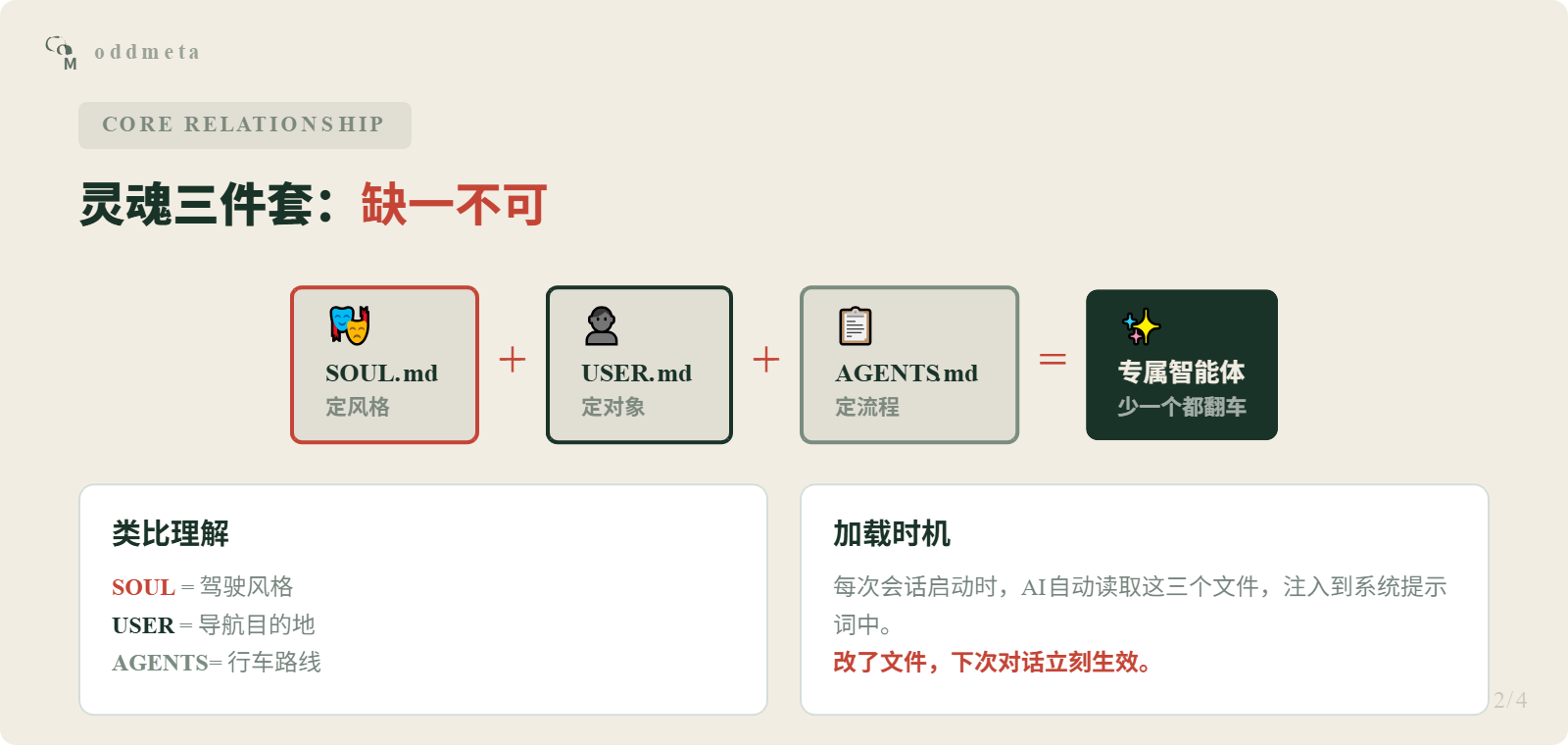 SOUL.md 定风格,USER.md 定对象,AGENTS.md 定流程。 少一个,都容易翻车。