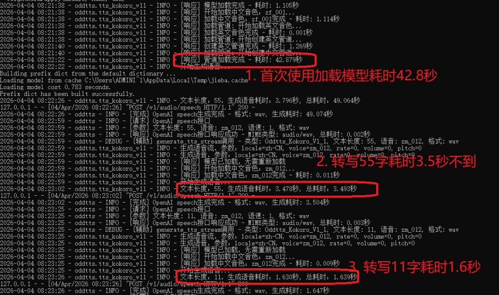 - 首次运行某一个模型的时间需要下载模型,并初始化模型,可能需要耗时几十秒到几分钟,具体时间跟你的电脑的配置,以及你的网速直接相关。在我的这个老笔记本上首次运行Kokoro耗时42.8秒左右。
