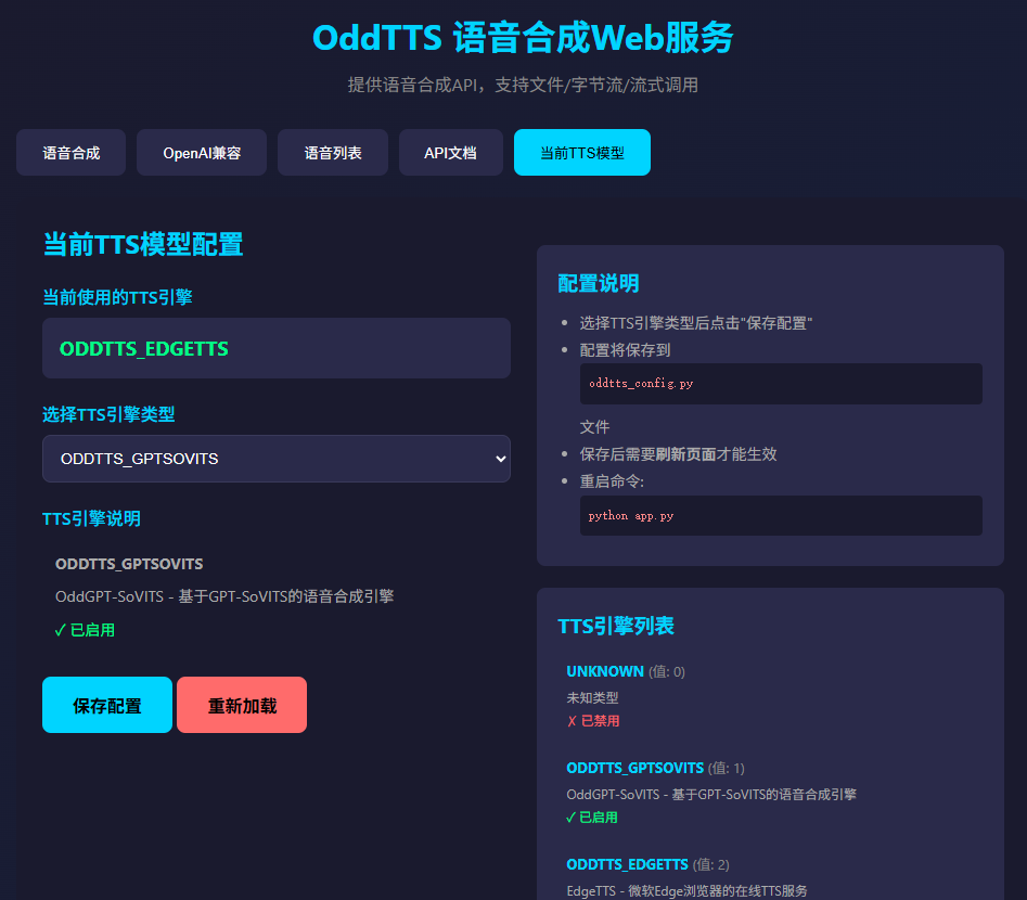 - 现在可以直接在oddtts的web界面上手动修改、切换TTS引擎/模型了